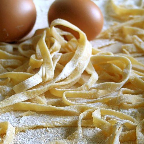 Typical pasta shape from Emilia Romagna, Italy. Its legendary origin is the story of a wedding, between Lucrezia Borgia and the Duke of Ferrara, Sir Alfonso d'Este. The bride was beautiful, with long goldie blod hair. The wedding chef, master Zefirano, took inspirations from those blonde hair and cut egg pasta in long yellow gold stripes.