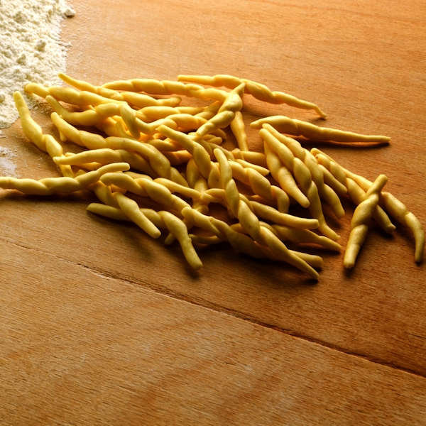 Typical pasta shape from Tuscany, Italy. It is a review of tagliatelle from Emilia. Tuscan cuisine is of a much more intense flavour and saucy: this needs a much more wide pasta to be kept on, and rough. That's why in Tuscany the egg pasta is double the larger and rough, the pappardelle.